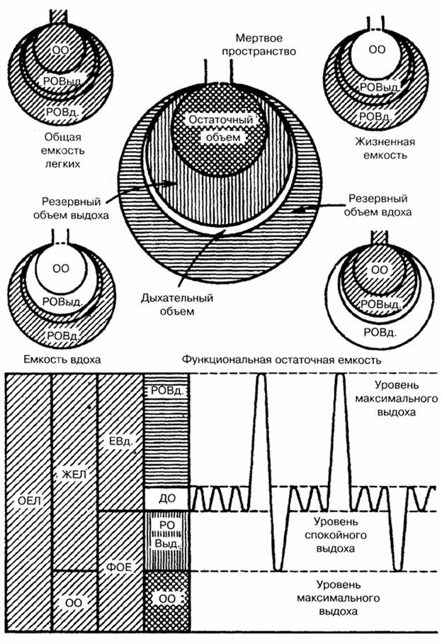 Объем воздуха, вдыхаемый при обычном (неусиленном) вдохе и выдыхаемый при обычном (неусиленном) выдохе, называется дыхательным воздухом. Объем максимального выдоха после предшествовавшего максимального вдоха называется жизненной емкостью легких (ЖЕЛ). Она не равна всему объему воздуха в легком (общему объему легкого), поскольку легкие полностью не спадаются. Объем воздуха, который остается в неспавшихся легких, называется остаточным воздухом. Имеется дополнительный объем, который можно вдохнуть при максимальном усилии после нормального вдоха. А тот воздух, который выдыхается максимальным усилием после нормального выдоха, это резервный объем выдоха. Функциональная остаточная емкость состоит из резервного объема выдоха и остаточного объема. Это тот находящийся в легких воздух, в котором разбавляется нормальный дыхательный воздух. Вследствие этого состав газа в легких после одного дыхательного движения обычно резко не меняется.