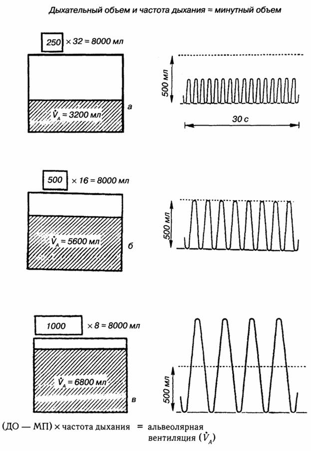 Поскольку МАВ определяет газообмен, уменьшение доли ее в МОД будет приводить к ухудшению газообмена и наоборот. При одном и том же МОД увеличение частоты дыхания (ЧД) приводит к снижению МАВ и, следовательно, к ухудшению газообмена. На рис. 9 показано, что один и тот же МОД (8000 мл) может быть получен при разной частоте дыхания (и, конечно, при разном ДО). Но если при нормальной ЧД и нормальном ДО доля альвеолярной вентиляции в МОД достаточно высока и составляет 5600 мл (см. рис. 17.31, б), то при тахипноэ МАВ снижается до 3200 мл, а доля объема, не участвующего в газообмене, увеличивается (см. 17.31, а). Это влечет за собой ухудшение газообмена и увеличение цены дыхания.