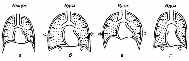 Рис. 10. Схема, иллюстрирующая "наружное парадоксальное дыхание": а, б - взаимоотношение реберного каркаса грудной клетки и диафрагмы в момент нормального выдоха и вдоха; в - реберное дыхание; г - диафрагмальное дыхание