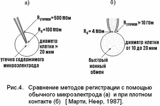 2. Сопротивление утечки микроэлектрод-клетка при использовании обычных микроэлектродов не превышает 500 МОм, в то время как соответствующее значение сопротивления утечки при РЦК могут быть 20 ГОм и более.