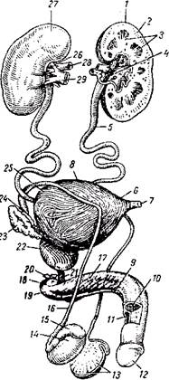 Рис. . Мочеполовой аппарат мужчины (полусхематично). 1—левая почка; 2—корковое вещество почки; 3—мозговое вещество почки; 4—почечная лоханка; 5—левый мочеточник; 6—верхушка мочевого пузыря; 7—пузырно-пупочная связка (остаток мочевого протока зародыша); 8—тело мочевого пузыря; 9—губчатое тело полового члена; 10—пещеристое тело полового члена; 11—губчатая часть мочеиспускательного канала; 12—головка полового члена; 13—дольки яичка; 14—яичко; 15—придаток яичка; 16—семявыносящий проток; 17— седалищно-пещеристая мышца; 18— луковица полового члена: 19— луковично-губчатая мышца; 20— бульбоуретральная железа; 21 — перепончатая часть мочеиспускательного канала: 22— предстательная железа; 23— семенной пузырек; 24—ампула семявыносящего протока; 25—дно мочевого пузыря; 26—правая почка; 27— ворота почки; 28—почечная артерия; 29—почечная вена.