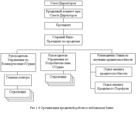В рамках своей организационной структуры каждый банк создает отдел или группу отделов, которые отвечают за выдачу и оформление кредитов, анализ ссудного портфеля, контроль за ходом погашения предоставленных кредитов и т.д. В небольших банках процедура выдачи кредитов предельно упрощена; каждый кредитный инспектор обслуживает разные категории заемщиков и выполняет всю работу по оценке кредитоспособности клиента и т.п.