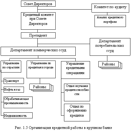 В крупном банке (рис. 1.5) происходит специализация и сегментация отдельных функций кредитования. При этом отраслевой принцип организации ссудных операций сочетается с географическим. Выделяются две крупные «ветви» кредитных операций. Одна группа отделов, осуществляет выдачу деловых кредитов. Старшие руководители банка возглавляют отделы по кредитованию предприятий различных отраслей, выдаче внешних кредитов, кредитованию клиентуры в городских районах и операции в провинции. Кроме того, есть большой отдел кредитных операций, выполняющий работу по анализу финансового положения клиентов, подготовке всей документации, оформлению ссуд и контролю за их погашением. Вторая «ветвь» организационной структуры контролирует операции по кредитованию потребителей и тесно связана с работой филиальной сети банка. На верхних этажах банковской администрации имеется кредитный комитет, рассматривающий дела о предоставлении крупных ссуд и утверждающий рядовые сделки, комитет по аудиту и подразделения , осуществляющие анализ кредитного портфеля. Стратегию кредитной политики определяет совет директоров банка.
