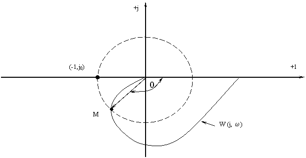 q(wм)─аргумент вектора ОМ; wм─частота в точке М амплитудно-фазовой характеристики; (-1, j0)─координаты критической точки K, где система теряет устойчивость.