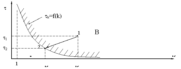 В соответствии с вариантом плана финансово-экономических мероприятий система, например, попала в точку 1 (рисунок 3.3). В этом случае внедрение плана мероприятий по управлению финансово-экономическим объектом даст отрицательный результат. Необходимо предложить пути улучшения первоначального плана, для чего хотя бы уменьшить время внедрения мероприятий с t1 до t2 или повысить их эффективность (K1>K2) . Тогда перейдем в зону А (см. точку 2). Скорректированный план принесет успех, и процессы управления будут устойчивее.
