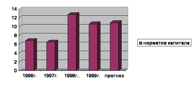 Нормативное значение этого коэффициента должно быть не меньше 8%. Анализируя полученные значения (рисунок 3.4), можно сказать о том, что банк является платежеспособным и надежным для клиентов, банк может рассчитаться по своим обязательствам. Как видим, данный показатель по сравнению с 1999 годом увеличился, что свидетельствует о положительном влиянии предложенных мероприятий.