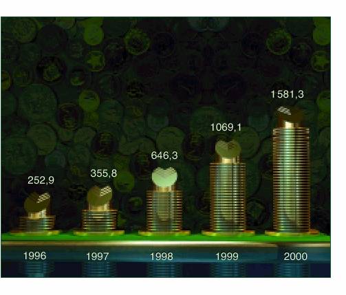 Проведенная во втором полугодии 2000 г. перестройка системы управления и организационной структуры, не помешала банку достичь по итогам года весомых финансовых результатов, добиться качественного изменения основных составляющих экономического роста. Валюта баланса банка возросла в полтора раза и достигла 1,6 трлн. руб., чистые активы 2 выросли на 46%, достигнув 572 млрд. руб.