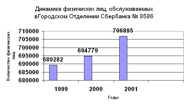 Динамика изменений за последние годы свидетельствует об общем увеличении численности физических лиц, обслуживаемых в Городсом Отделении Сбербанка № 8586. Так, в 1999 году количество клиентов составляло 689282 человека, в 2000 году их количество увеличилось на 5497 и составило 694779 человек. За последний год количество физических лиц величилось на 12116 и достигло 706895 человек.