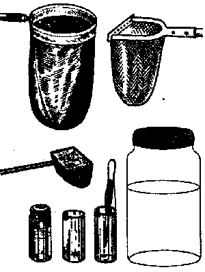Оборудование. Водный сачок: диаметр обруча 30 см, глубина мешка (не из марли) 45 см, ручка —2 м. Скребок с концевой заостренной пластиной длиной 20 см. Небольшой таз (пластмассовый) или ведро. Фотокювета или эмалированная тарелка. Стеклянные банки с крышками. Пробирки с пробками. Целые или обрезанные пластиковые прозрачные бутылки. Маленький сачок диаметром 5 см. Пинцет на шнурке. Резиновая груша на стеклянной трубочке. Лупа (10-20-кратная). Ножницы, нож, скальпель. Записная книжка, карандаш.