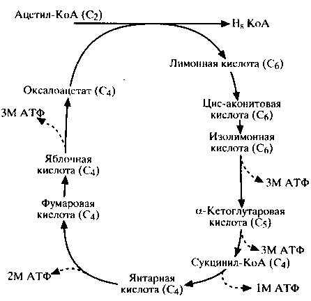 Образовавшийся в результате гликолиза в цикле Эмбдена-Меергофа ацетил-КоА (продукт окислительного декарбоксилирования пирувата) окисляется до воды и углекислого газа в цикле Кребса (лимоннокислый цикл). Этот процесс осуществляется последовательными ферментативными реакциями, в результате которых высвобождается энергия (схема 6). Полный распад одной молекулы глюкозы дает 38 молекул АТФ, причем 24 из них образуются в цикле Кребса. Ферменты этого цикла локализуются в матриксе митохондрий (в стенке внутренней мембраны). Поступивший в цикл Кребса ацетил-КоА является конечным продуктом катаболизма не только углеводов, но также липидов и таких аминокислот, как фенилаланин, тирозин, лейцин и изолейцин.