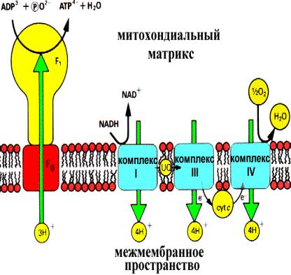 Существует несколько гипотез, объясняющих механизм сопряжения. Одной из них является хемоосмотическая теория. Цепь транспорта электронов функционирует как протонная (Н+)помпа, осуществляя перенос протонов из матрикса через внутреннюю мембрану в межмембранное пространство. Эндоэргический процесс выброса протонов из матрикса возможен за счет экзоэргических окислительно-восстановительных реакций дыхательной цепи. Перенос протонов приводит к возникновению разности концентрации Н+ с двух сторон митохондриальной мембраны: более высокая концентрация будет снаружи и более низкая - внутри. Митохондрия в результате переходит в «энергизованное» состояние, так как возникает градиент концентрации Н+ и одновременно разность электрических потенциалов со знаком плюс на наружной поверхности.