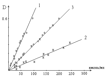 Калибровочные кривые. 3 получена с помощью микрометода на основе реакции Сакагучи (520 нм) по растворам аргинина (х) и по пептидному гидролизу лизоцима (о); 1 и 2 - с помощью реакции Фолина (760 нм): 2 - по растворам тирозина, 1 - по пептидному гидролизу лизоцима. Значение оптической плотности