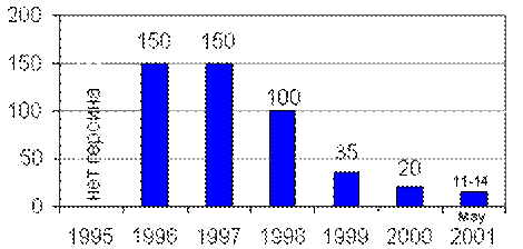 В советское время героина на рынке не было, а заменяющий его раствор ацетилированного опия стоил дорого, и достать его было трудно. Подростки не знали технологии его приготовления и не могли "сварить" его без помощи опытного наркомана. Это, несомненно, сдерживало распространение опийной наркомании. Нынешний же героин остается только развести водой. Дешевизна порций делает его легкодоступным даже для школьников. Например, в Петербурге героин начал широко распространяться в 1996-1997 гг. Он пришел по цене 150 долл. за грамм. Цена долгое время держалась. К маю 2000 года цена на героин опустилась до 11-14 долл. за грамм, а то и ниже (см. рис. 2).