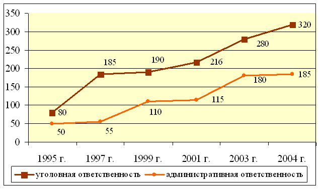 А теперь поговорим о вкладе органов внутренних дел в реализацию государственной политики противодействия наркотикам. Если анализировать не эффективность работы милиции, а общую активность ее борьбы с наркопреступностью, то результаты впечатляют. Судите сами: до 1998 г. в стране сотрудниками МВД выявлялось всего 16 тыс. наркопреступлений в год; а после принятия закона - 240 тыс. (см. рис. 1). Означает ли этот результат, что на улицах российских городов подростку (а тем более взрослому) трудно купить героин или марихуану? Нет, не означает. Доступность их так высока, что денег, получаемых учащимися от родителей на два обеда, уже хватает для покупки чека героина. А ведь главной задачей милицейских структур при наличии в обществе социальной наркоэпидемии должно быть ограничение доступности наркотиков.