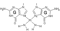 С нуклеотидными основаниями ДДП (дихлородиамминплатина, синоним цисплатина) образует продукты вытеснения обоих атомов хлора из координационной сферы Pt. С пуриновыми нуклеотидами атом платины связывается не через экзоциклическую аминогруппу, как можно было бы предположить, а через гетероциклический атом азота N7, образуя комплексы состава цис-Pt(NH3)2(Guanine-N7)2 и цис-Pt(NH3)2(Guanine-N7)(Adenine-N7). Резкое преобладание первых (выявленное в конкурентных реакциях) объясняется образованием дополнительной водородной связи между протоном аминогруппы и экзоциклическим C6-кислородом гуанина. С цитозином связывание происходит через N3, с тимином и урацилом в нейтральном растворе оно слабо. Ряд “предпочтений” можно построить следующим образом: Guanine-N7 >> Adenine-N7 > Adenine-N1 > Cytidine-N3 >> Thymine & Uracil. Наличие фосфатной группы в 5´-положении фуранозного цикла ускоряет реакцию из-за образования водородных связей между кислородом фосфата и протонами амминных лигандов.