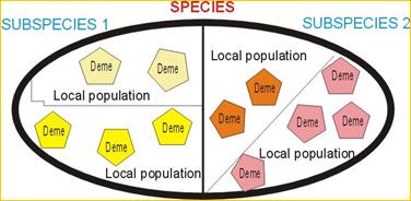 Схематическое представление о внутривидовой структуре (Рис. 2). Рис. 2. Главные внутривидовые подразделения: 1) подвиды (географические расы), 2) локальные популяции (стада), 3) демы (субпопуляции, Менделевские популяции). |