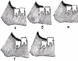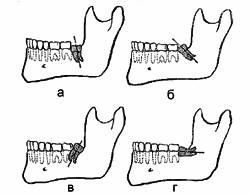 б - частичная ретенция нижнего восьмого зуба с распространенной околокоронковой сумкой; в - полная ретенция под слизистой оболочкой; г - полная ретенция под костью и слизистой оболочкой; д - полная костная ретенция.
