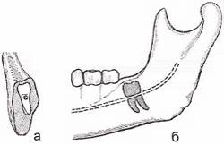 Рис. 5 а - нижнечелюстной канал, проходящий через нижний ретенированный восьмой зуб;
