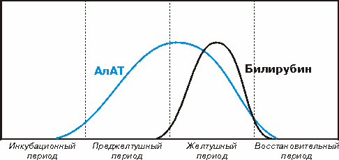 Рисунок. Соотношение концентрации билирубина и активности органоспецифического печеночного фермента АлАТ в различные периоды болезни.