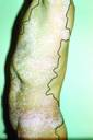 Клиническая картина. Заболевание возникает на фоне здоровой кожи в форме белых депигментированных пятен, склонных к росту и слиянию. Исчезновению пигмента не редко предшествует воспалительная эритема, быстро исчезающая. Волосы на витилигинозном пятне часто обесцвечиваются, но могут сохранять окраску. Депигментированные пятна могут появляться на любом участке кохного покрова, часто симметрично. Участки кожи, лишенные пигмента, чувствительны к УФ-лучам, под влиянием облучения они воспаляются с образованием эритемы, но пигментация не восстанавливается. Витилиго часто начинается в детстве и постепенно прогрессирует.