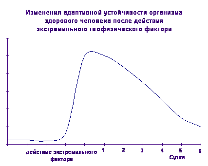 Графически интегрированный показатель изменения адаптивной устойчивости организма после биологически значимого изменения геофизического, погодного, климатического, ритмологического или экологического фактора можно представить в виде кривой (рис.1), на которой видно как сразу же после действия средового фактора за счет мобилизации внутренних резервов возникает заметный достоверный подъем уровня адаптивной устойчивости организма человека. Это, как мы уже показали в таблице 1, сопровождается усилением функциональной активности всех гомеостатических систем. При этом высокий уровень функционирования жизнеобеспечивающих органов и систем сохраняется на протяжении двух-пяти суток в зависимости от экстремальности воздействовавшего фактора и от уровня резервных возможностей организма.