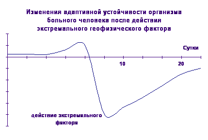 На рисунке 2 интегрированный показатель изменения адаптивной устойчивости организма у больного после биологически значимого изменения геофизического, погодного, климатического, ритмологического или экологического фактора можно представить в виде кривой, на которой видно как сразу же после действия средового фактора за счет мобилизации внутренних резервов возникает незначительный краткосрочный (в течение 2-4 часов) подъем уровня адаптивной устойчивости, сменяющийся затем достоверным ее снижением.