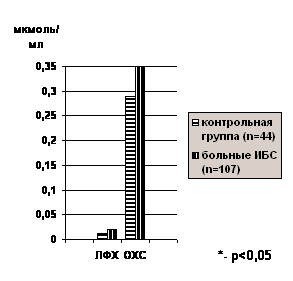 У больных стабильной стенокардией по сравнению со здоровыми лицами в клеточных мембранах Тр обнаружено достоверное (p<0,05) возрастание ЛФХ. Параллельно отмечалось статистически значимое (p<0,05) увеличение содержания ОХС, сопровождавшееся ростом соотношения ОХС/ОФЛ по отношению к его уровню у здоровых лиц (Рис 1, 2).