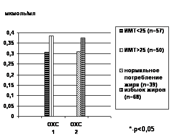 Рис. 3. Содержание ОХС у больных cповышенным весом и больных, потреблявших избыточное количество жиров