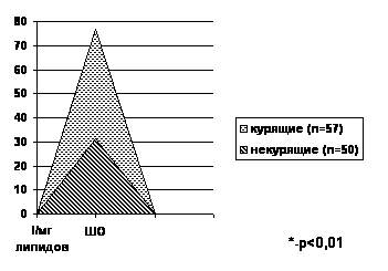 Особого внимания заслуживает достоверное увеличение содержания ОХС (p<0,01), а также соотношения ОХС/ОФЛ (p<0,05) в мембранах Тр у курящих больных ИБС.