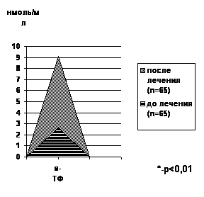 Согласно данным корреляционного анализа, были получены определенные взаимосвязи между количеством выкуриваемых сигарет и содержанием ОХС (rxy=+0,367, p<0,05), ШО (rxy=+0,312, p<0,05) и a-ТФ (rxy=-0,422, p<0,05) в мембранах Тр. Эти результаты, в какой-то мере, согласуются с данными Brezinka and Padmos (1993) о том, что риск внутрикоронарного тромбоза достоверно связан с количеством выкуриваемых сигарет.