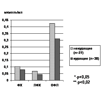 Комплекс нативных ФЛ “Витол” у некурящих больных ИБС оказывал более выраженное воздействие на фосфолипидный состав мембран Тр. (Рис.7). Данные корреляционного анализа также показывают, что курение имеет обратную связь уровнем ОФЛ (rxy=-0,360; p<0,05) и прямую связь с содержанием ОХС (rxy=+0,453; p<0,05).