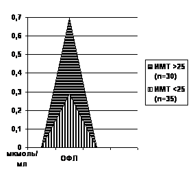 У больных избыточным весом (ИМТ>25кг/м2) по сравнению с больными с нормальным весом наблюдался более выраженное (p<0,01) увеличение содержания a-ТФ при его равных исходных значениях.