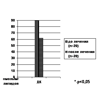 После лечения нативными ФЛ обращает внимание снижение с высокой степенью достоверности уровня ДК и статистически значимое увеличение содержания основного жирорастворимого антиоксиданта a-ТФ как при нормо-, так и гиперхолестеринемии.
