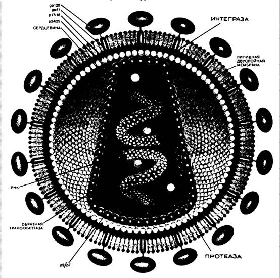 Сердцевина вируса содержит белок р25 (или р24), РНК, несущую генетическую информацию и окруженную молекулами белка р9/р7, и ферменты – обратную транскриптазу, интегразу и протеазу. При участие обратной транскриптазы синтезируется провирусная ДНК, интеграза катализирует встраивание провирусной ДНК в хромосомную ДНК клетки и эта провирусная ДНК остается в латентном состоянии, пока клетка чем-нибудь не активируется. Тогда начинается продукция новой генерации вируса.