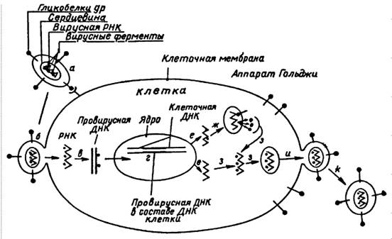 Рис 3. Схема жизненного цикла ВИЧ: а) связывание вируса в клетки-мишени; б) разрушение мембраны клетки; в) обратная транскриптаза и образование провирусной ДНК; г) интеграция провирусной ДНК в клетку-хозяина; е) синтез вирусной ДНК; ж) синтез вирусных белков; з) созревание вируса; и) окружение вируса липидами клеточной мембраны; к) выход вируса из клетки.