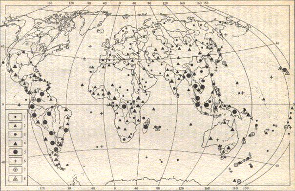Рис.1. Распределение редких, находящихся под угрозой исчезновения и вымерших видов птиц: число редких исчезающих и требующих специальной охраны видов: 1-1-2, 2-3-5, 3-6-10, 4-11-20, 5 – более 20; число вымерших видов птиц 6-1-2, 7-3-5, 8-более 6.