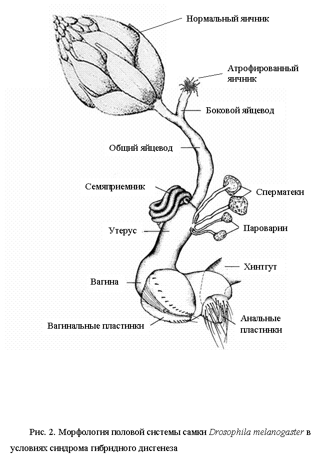 Атрофия гонад одно из характерных и интенсивно изучаемых аспектов P-M и H-E систем гибридного дисгенеза. GD-стерильность является следствием вымирания клеток в примордиальной зародышевой линии возможно из-за хромосомных разрывов, опосредованных активностью P-элемента (Niki, Chigusa, 1986). Однако ни кинетика гибели зародышевых клеток, ни число клеток, которые должны быть элиминированы для появления GD-стерильности не известно. Первые признаки стерильности появляются уже у 5-6 часовых эмбрионов. Максимальный уровень гибели клеток наблюдается на личиночной стадии развития, когда зародышевые клетки испытывают экспоненциальный рост, но некоторые умирающие клетки были обнаружены до деления клеток зародышевой линии (Niki, Chigusa, 1986). Механизм гибели клеток может быть обусловлен разрывами хромосом, имеющими летальный эффект. Следствием этого является отсутствие половых клеток в яичниках и семенниках и общее недоразвитие их у взрослых гибридных самок и самцов. Гибриды могут быть полностью стерильны, если редуцированы обе железы и частично фертильны, если атрофирован один семенник или яичник (рис.2) (Kidwell et al., 1977). Не атрофированные гонады у дисгенных гибридов часто отстают в своем развитии и содержат меньшее число яиц или сперматоцитов по сравнению с недисгенными особями (Ashburner, 1989). Степень выраженности гонадной атрофии сильно зависит от температуры, при которой идет развитие гибридов. В отношении Р-М системы атрофия наиболее значительна при 29° С у самок и при 27° С у самцов, а при 24° С и ниже практически отсутствует (Kidwell et al., 1977; Engels, Preston, 1984). Для Н-Е системы характерна наиболее сильная атрофия при 25° С и наименьшая при 29° С (Stamatis et al., 1989). При более низких температурах АГ наблюдается в меньшей степени. Количество и размерность копий Р- и hobo-элементов так же сильно влияют на способность линий индуцировать гибридный дисгенез, в связи с чем, частота гонадной атрофии может изменяться от нескольких до ста процентов (Yannopoulos et al., 1987; Kidwell et al., 1988; Rasmusson et al., 1993).