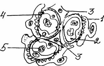 I - подоциты; 2 - капилляр; 3 - мезангиальные клетки; 4 - базальная мембрана;