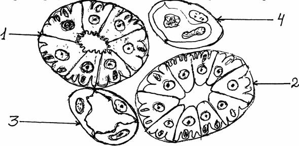 1 - извитой канадец 1-го порядка (проксимальный каналец); 2 - извитой каналец 2-го порядка (дистальный каналец); 3 - тонкая часть петли Генле; 4 - капилляр.