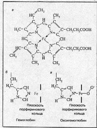 перпендикулярно к плоскости порфиринового кольца по обе его стороны. Гемы расположены вблизи поверхности белковой глобулы в специальных карманах, образованных складками полипептидных цепочек глобина. Гемоглобин при нормальном функционировании может находиться в одной из трех форм: феррогемоглобин (обычно называемый дезоксигемоглобином или просто гемоглобином), оксигемоглобин и ферригемоглобин (называемый также метгемоглобином). В феррогемоглобине железо находится в закисной форме Fe(II), одна из двух связей, перпендикулярных к плоскости порфиринового кольца, направлена к атому азота гистидинового остатка, а вторая связь свободна (рис.1, б). Кроме этого гистидинового остатка, называемого проксимальным (соседним), по другую сторону порфиринового кольца и на большем расстоянии от него находится другой гистидиновый остаток — дистальный гистидин, не связанный непосредственно с атомом железа. Взаимодействие молекулярного кислорода со свободным гемом приводит к необратимому окислению атома железа гема [Fe(II) Þ Fе(III); гем Þ гемин]. В дезоксигемоглобине глобин предохраняет железо гема от окисления.