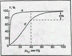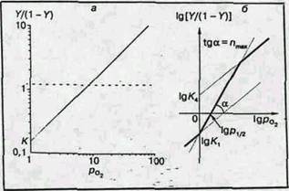 Прежде чем рассмотреть эту главную функциональную реакцию гемоглобина более детально, необходимо сказать несколько слов о мышечном гемоглобине — миоглобине. Этот красящий белок поперечнополосатых мышц представляет собой комплекс гема с "четвертушкой" глобина. Он содержит одну молекулу гема и одну полипептидную цепочку, состав и структура которой подобны составу и структуре b-субъединицы гемоглобина. Как и для гемоглобина, важнейшей функцией миоглобина является обратимое присоединение молекулярного кислорода. Эту функцию характеризует так называемая кривая оксигенации, связывающая степень насыщения гемоглобина кислородом (в процентах) с парциальным давлением последнего, рО2 (мм Hg). Типичные кривые оксигенации гемоглобина и миоглобина (при условии достижения химического равновесия) приведены на рис.2, а, б. Для миоглобина кривая является гиперболой, как и должно быть в случае одностадийной химической реакции при условии достижения химического равновесия: