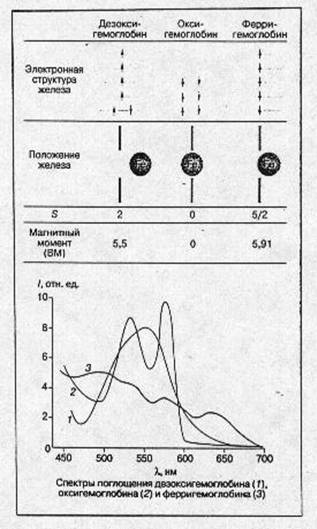 В молекуле дезоксигемоглобина железо отстоит от плоскости порфиринового кольца примерно на 0,5-0,6 А° (есть небольшие отличия между a- и b-субъединицами). Из шести 3d электронов железа Fe(II) два электрона спарены на одной из низших d-орбиталей (dxy, dyz, dxs), а четыре электрона занимают оставшиеся d-орбитали, их спиновые моменты, согласно правилу Хунда, параллельны и суммарный спин S-2. Магнитный момент гема в этом состоянии равен ~ 5,5 боровского магнетона (БМ), а спектр поглощения в зеленой области имеет характерную полосу с lmax ~ 556 нм. Присоединение кислорода ведет к значительным изменениям. Атом железа в оксигемоглобине лежит практически в плоскости порфиринового кольца (расстояние до плоскости составляет 0,16 А° в α- и 0,00 А° в β- субъединицах). Все шесть d-электронов спарены на трех низших d-орбиталях, S= 0, оксигемоглобин диамагнитен. В зеленой области спектра имеются две характерные полосы поглощения: а (lmax 576 А°) и b (542 А°).