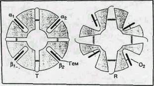 Рис. 5. Структурная схема перехода гемоглобина от Т- к R-форме