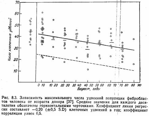 Более того, было показано, что при культивировании фибробластов кожи, полученных от людей в возрасте 10—90 лет, наблюдается снижение потенциала удвоения примерно на 0,20 относительные единицы в расчете на каждый год жизни донора. Коэффициент регрессии составляет —0,20. Сообщение Голдстейна и др. о том, что не хронологический возраст донора, а скорее его физиологическое состояние ответственно за скорость роста фибробластов, побудило многих авторов проделать скрупулезную работу с клетками разных типов, чтобы установить, действительно ли существует линейная связь между хронологическим возрастом и удвоением популяции. Изучение культур фибробластов, источником которых служили клетки тщательно отобранных здоровых доноров, не предрасположенных к диабету, дало отрицательный результат: обратная зависимость между возрастом донора и числом удвоений популяции не была обнаружена. В то же время эта зависимость была установлена для культур клеток, полученных от больных диабетом или от лиц, генетически предрасположенных к этому заболеванию. Таким образом, именно физиологическое состояние в большей степени, чем хронологический возраст, определяет пролиферативную активность клеток.