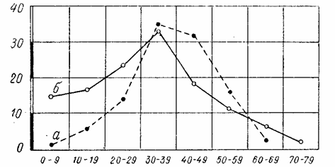 а — повозрастное распределение,населения, б — повозрастное распределение больных опухолью спинного мозга.