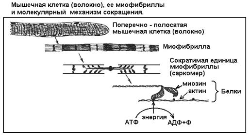 Главное, что следует вынести из описания мышечной функции, это понимание простой физико-химической сущности движения, которая сводится к изменению объемной формы молекулы белка миозина. Эта форма, или третичная структура, в свою очередь зависит от силы химических связей внутри молекулы. При энергетическом разряде от распада молекулы АТФ сила связей резко, но кратковременно изменяется - молекула «вздрагивает» (сгибается и тут же разгибается), совершая работу. Суть реакции миозина настолько проста, что воспроизводится in vitro («в стекле», в пробирке, то есть в искусственных условиях) на чистых белках, выделенных из клеток, или даже на мертвых клетках при добавлении АТФ. Добавим, что аналогичный механизм движения, но с другими белками, известен для ресничек и жгутиков, которыми снабжены многие одноклеточные организмы (например, инфузория), сперматозоиды, некоторые покровные (эпителиальные) ткани. Итак, движение - важное проявление жизни - имеет вполне материальную сущность.