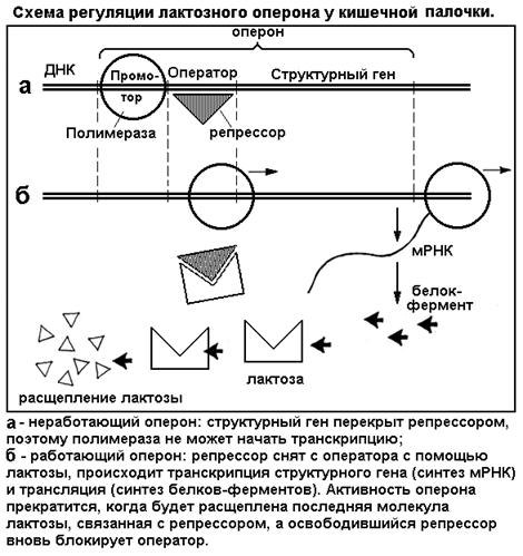 Лактозный оперон - участок молекулы ДНК - состоит из трех частей: промотора, оператора и структурного гена. Промотор - стартовый участок гена, сюда садится фермент РНК-полимераза, ведущий транскрипцию. Оператор - пусковой барьер, в отсутствие лактозы закрытый специальным белком-репрессором. Структурный ген (точнее - здесь находится цепочка, семейство генов) - основной участок ДНК, кодирующий и производящий через иРНК нужный белок-фермент. Пока оператор связан с белком-репрессором, полимераза не может стартовать и структурный ген не работает, синтез фермента отсутствует (см. рис. 19 а). Когда в клетку попадает лактоза, одна ее молекула связывается с репрессором и отнимает его от оператора. Теперь путь полимеразе открыт, идет синтез иРНК (транскрипция) и, далее, синтез соответствующего белка-фермента (трансляция) (рис. 19 б). Ферменты расщепляют поступивший в клетку сахар и в последнюю очередь ту его молекулу, которая связана с репрессором. Но когда будет переварена и эта последняя молекула, белок-репрессор освобождается и вновь блокирует оператор. Производство иРНК и фермента прекращается до поступления новой порции сахара. По своей простоте система регуляции гена концентрацией субстрата похожа на простые технические регуляторы. Напомним, однако, что у эукариот регуляция генной активности более сложная. Она включает возбуждение клеточных рецепторов гормонами или другими биологически активными веществами, запуск каскада реакций вторичных мессенджеров, которые поступают в ядро и избирательно активируют гены.