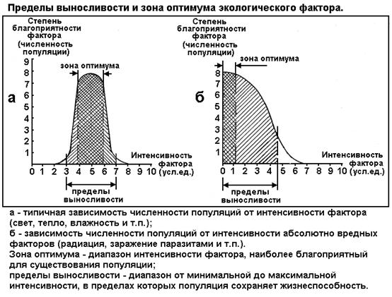Для каждого организма, популяции существуют пределы выносливости того или иного экологического фактора - от минимальной до максимальной интенсивности, в пределах которых организмы сохраняют жизнеспособность. Более узкую зону, в которой условия среды наиболее благоприятны, составляет оптимум экологического фактора. В зависимости от природы фактора кривая степени его благоприятности имеет разный вид (рис. 23). Для таких факторов, как радиация или наличие паразитов зона оптимума начинается от нуля (то есть лучше, когда их нет совсем). Для влажности воздуха, освещенности, температуры и т. п. степень благоприятности фактора описывается кривой нормального распределения (колоколообразная кривая), отставленной от абсолютного нулевого значения. То есть влага, свет, тепло необходимы организмам в определенном диапазоне интенсивностей.
