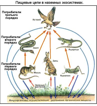 Цепи питания имеют разную сложность, число звеньев в каждом из трех уровней может быть различным. Допустим, вариант короткой цепи: растения - заяц - волк - черви, бактерии. Длинная цепь: растения - травоядные насекомые (саранча, лесной клоп и др.) - хищные насекомые (жужелица, личинка стрекозы, водяной клоп и др.) - насекомоядные птицы (ласточки, мухоловки и др.) - хищные птицы (орел, коршун и др.) - черви, бактерии. Морская цепь: фитопланктон - мелкие ракообразные, черви - рыбы, питающиеся рачками и червями - хищные рыбы - хищные птицы . В любой цепи возможны многочисленные ответвления и запасные пути. Если какой-то член выпадает, поток вещества идет по другим каналам. Допустим, выпадение личинок стрекоз компенсируется водными клопами - те и другие водные хищники. Если исчезает основной вид пищевой растительности, травоядные животные переходят на второстепенные корма. Если пропадают бабочки, ласточки ловят мух. От травоядных насекомых цепь может пойти вообще по другому пути: лягушка- цапля - лиса и т. д. Особенно большую путаницу в пищевые цепи вносят всеядные животные и, конечно, человек, так как они «встраиваются» в цепи в самых разных звеньях. Так что на самом деле существуют не цепи, а пищевые сети - каждый трофический уровень образован многими видами. Такое положение стабилизирует потоки вещества и энергии через живые сообщества, увеличивает устойчивость биоценозов. Тем не менее общее направление трофического потока неизменное - продуценты - консументы нескольких порядков - редуценты.