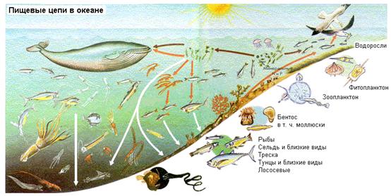 Таким образом, все организмы связаны переносом вещества и энергии, через них и через внешнюю среду совершается глобальный круговорот материи на Земле. Основным донором энергии для поддержания этого круговорота выступает Солнце - его световая энергия обеспечивает фотосинтез глюкозы у растений. Пути передачи вещества и энергии через пищевые отношения организмов обозначаются как цепи питания, или пищевые цепи. Эти цепи имеют одностороннюю направленность: от автотрофной биомассы продуцентов - в основном зеленых растений - к гетеротрофным консументам и далее к редуцентам. Значительная часть вещества возвращается в круговорот, но энергия, полученная от солнца, для живых организмов безвозвратно теряется, она либо аккумулируется в новых минералах почвы и донных осадков (каменные угли, мел и другие ископаемые), либо накапливается в виде тепла в оболочках Земли (разогрев атмосферы), либо рассеивается в Космос. Примеры пищевых цепей приведены на рис. 25 и 26.